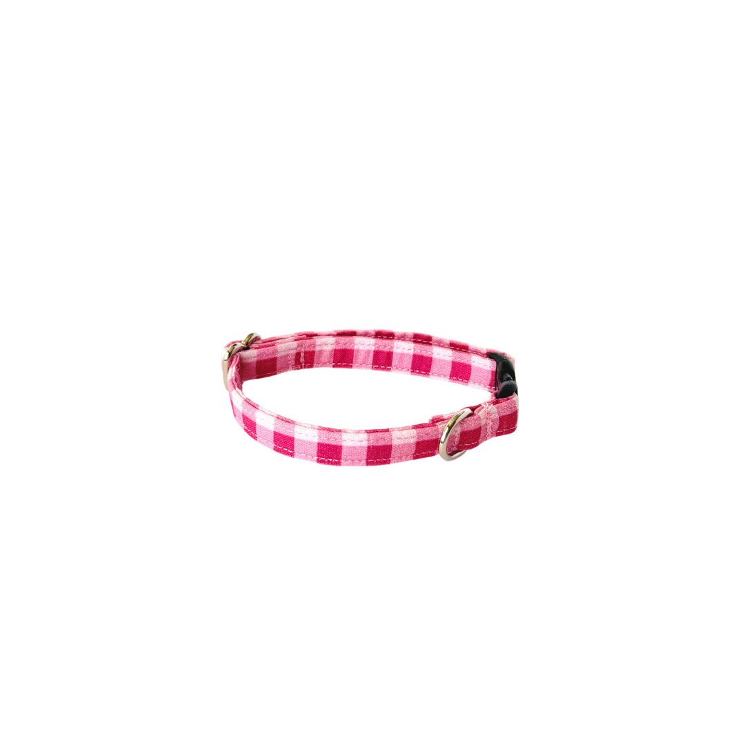 The Raspberry Sorbet Gingham Cat Collar is made with 100% cotton fabric and reinforced with mold proof webbing. Cat collars have a breakaway buckle closure, D-ring attachment for tags, and are adjustable.