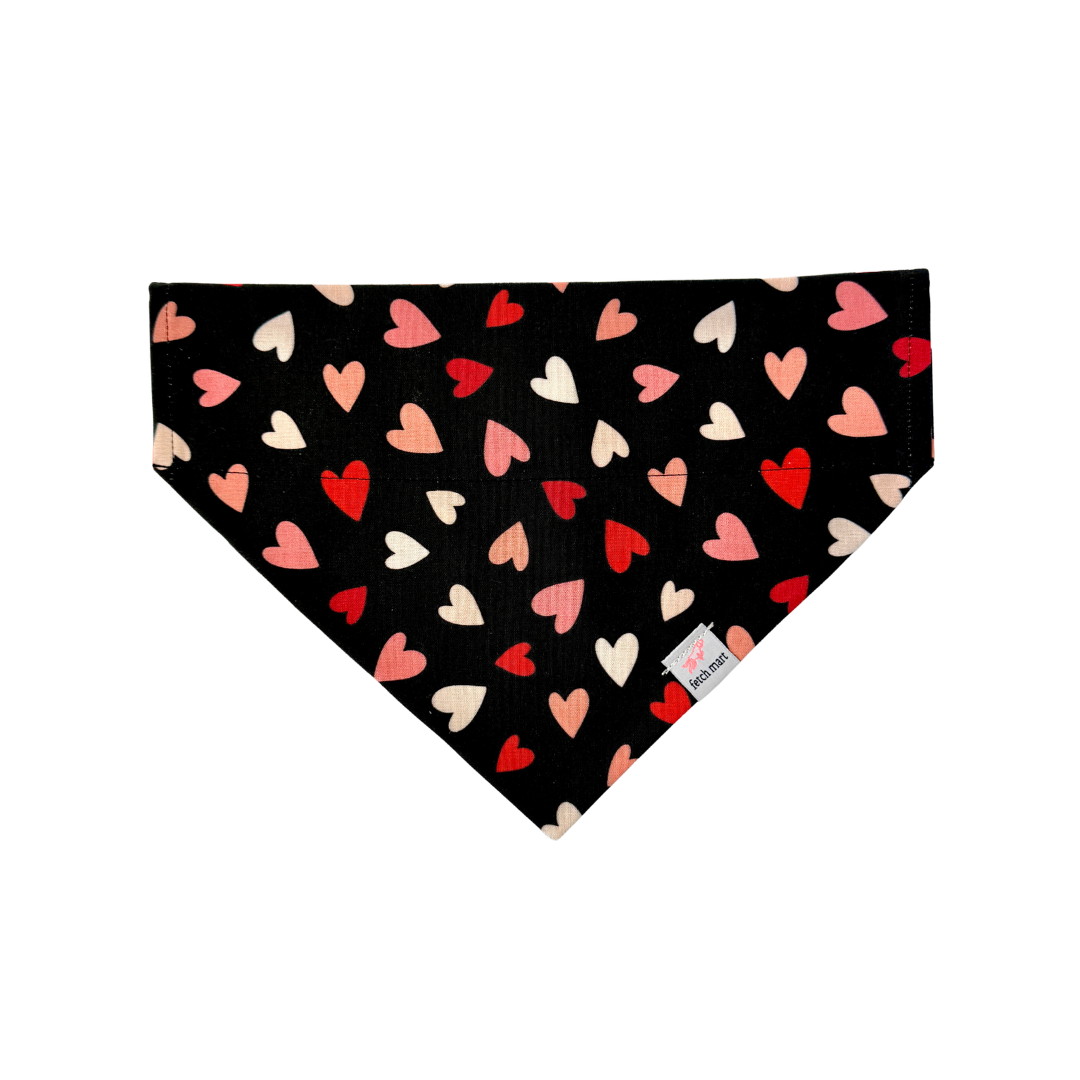 The Lovestruck Bandana is made with 100% cotton fabric. Slip on bandanas stay put and allow you to access the d-ring on your dogs collar. Tie on bandanas tie around your pets neck